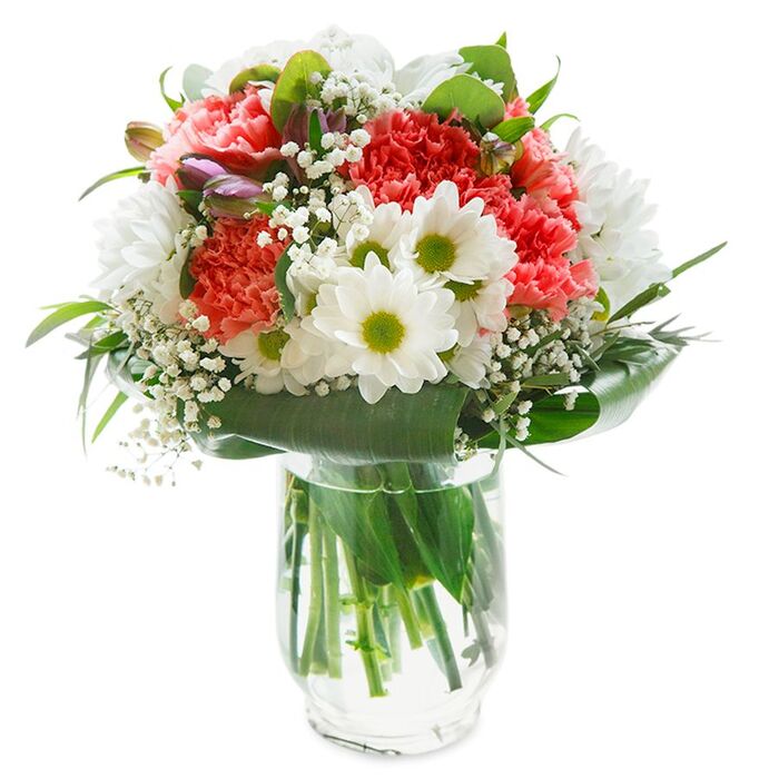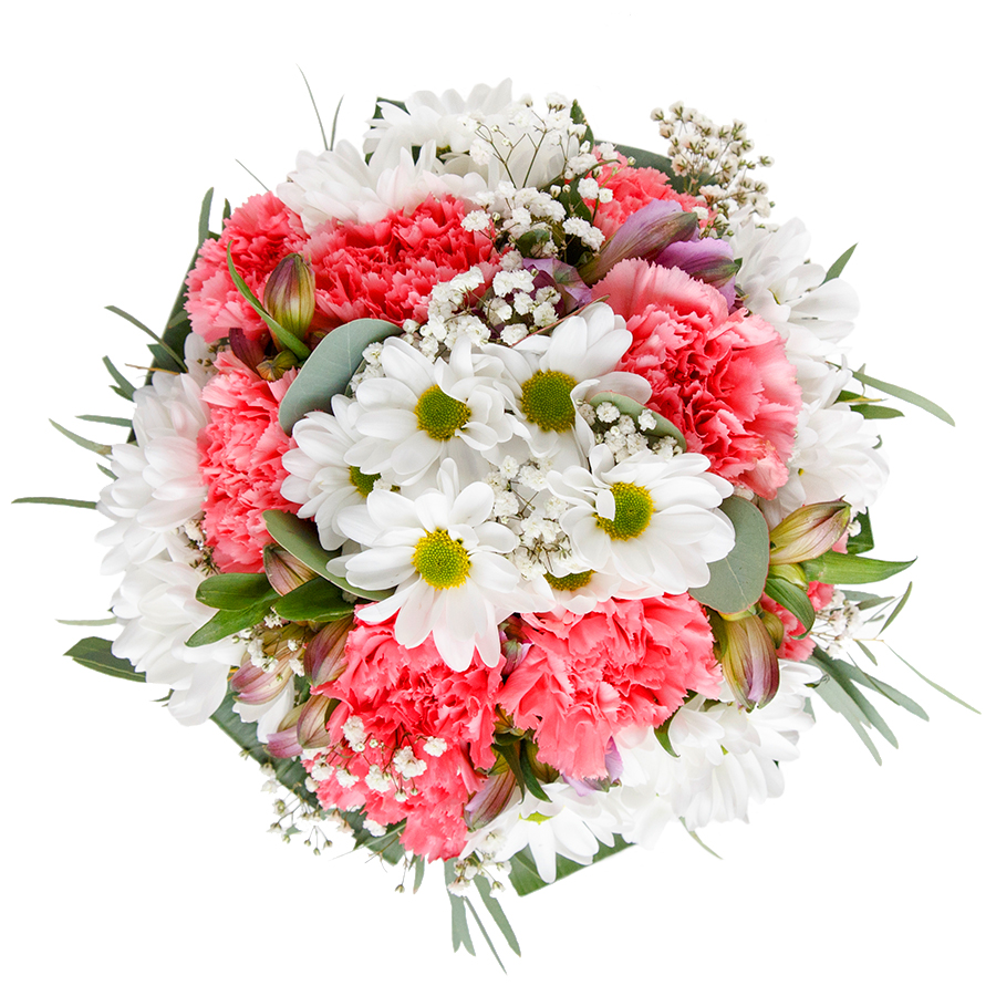 Our uniquely stunning flower bouquet is designed to bring joy and beauty to any setting. Featuring a delicate mix of snow-white chrysanthemums, airy gypsophila, and soft pink carnations, all beautifully arranged with vibrant aspidistra leaves.